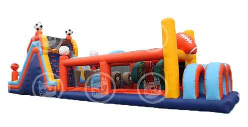 This 65 foot long, two-piece obstacle course is perfect for any sports lover! Run through sports themed obstacles, scramble up the climbing wall, and fly down the 18 foot slide!