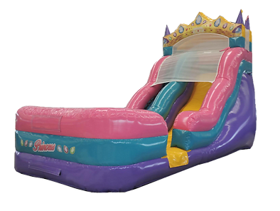 Feel like royalty with our Princess Dry Slide! Featuring bright colors and a jeweled crown design, this inflatable is sure to be a dream come true! Kids can keep the fun going smoothly and safely with an entrance on the left and exit on the right.
